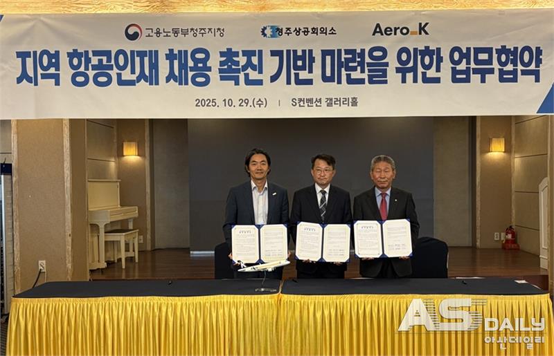 에어로케이항공(대표 강병호)이 10월 29일 고용노동부 청주지청, 청주상공회의소와 함께 ‘지역 항공일자리 채용 촉진 기반 마련을 위한 업무협약’을 체결했다. 이번 협약은 청주국제공항을 거점으로 한 항공산업 활성화와 청년 고용 확대를 위한 전략적 협력의 일환이다.협약식은 청주 오스코에서 열릴 예정인 ‘2025/2026 에어