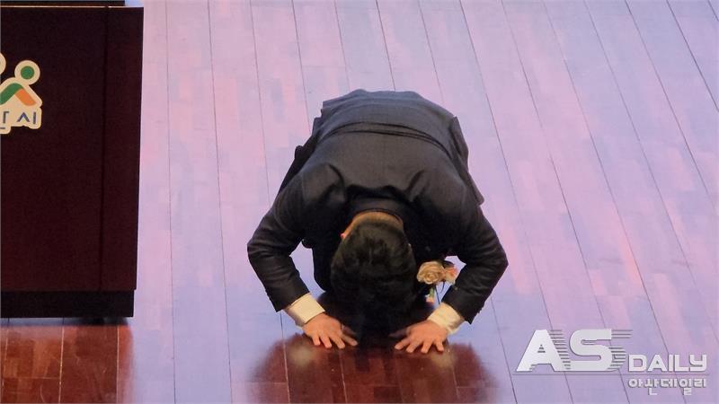 3일 아산시 시민홀에서 열린 직원 월례회에서 오세현 아산시장이 취임사를 통해 시민 행복을 최우선으로 하는 시정 운영 방침을 밝혔다.