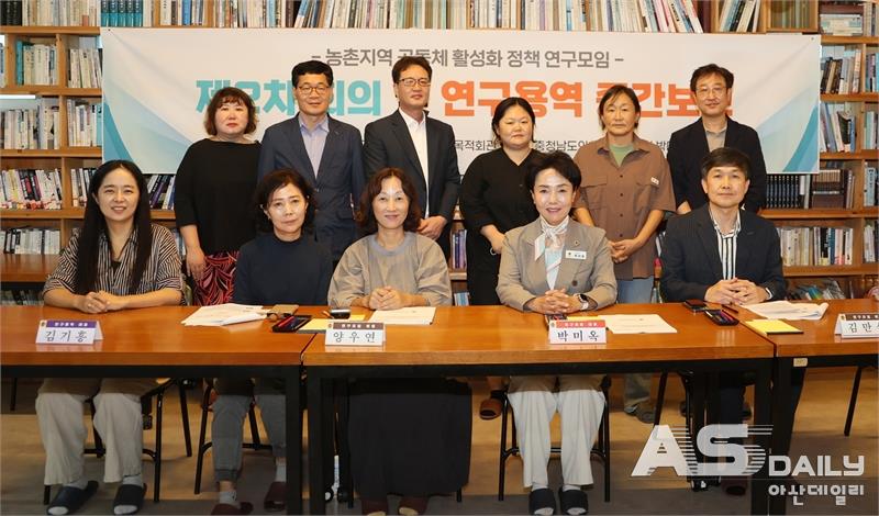 ‘농촌지역 공동체 활성화 정책 연구모임’(대표 박미옥 의원)은 이날 장곡 오누이다목적회관에서 연구용역 중간보고회를 개최하고, 충청남도 농촌 경제·사회서비스 공동체 지원센터 설치를 골자로 한 정책 방향을 논의했다.