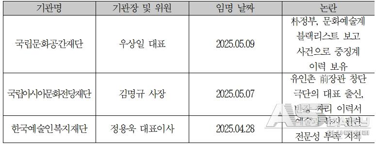 대표적인 사례로 지목된 정용욱 한국예술인복지재단 대표는 문화예술 분야 경력이 부족한 인물로, 문체부 종무실장으로 전보된 지 불과 몇 달 만에 재단 대표로 임명됐다. 국립문화공간재단 우상일 대표 역시 과거 ‘문화예술계 블랙리스트’ 작성에 관여한 전력이 있으며, 노조 반발로 임명이 무산된 이력이 있다. 국립아시아문화전당재단 김명규 사장은 유인촌 전 장관이 창단한 극단 대표 출신으로, 문화 다양성에 대한 전문성이 부족하다는 지적을 받고 있다.