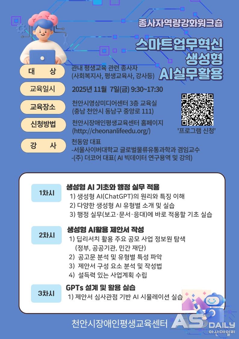 천안시장애인평생교육센터는 오는 11월 7일(금) 오전 9시 30분부터 오후 5시 30분까지 천안시영상미디어센터 3층 교육실에서 ‘스마트 업무 혁신과 생성형 AI 실무활용’ 역량 강화 워크숍을 개최한다고 밝혔다. 이번 교육은 천안 지역 평생교육 기관 및 단체 종사자들을 대상으로 하며, 참가비는 무료다.