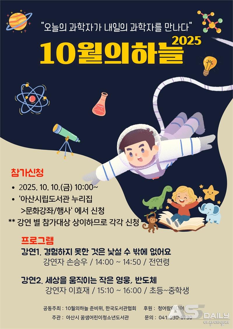 아산시가 오는 10월 25일 토요일, 탕정온샘도서관과 꿈샘어린이청소년도서관에서 전국 과학자들의 재능기부로 진행되는 ‘10월의 하늘’ 과학 강연을 개최한다. 이 행사는 KAIST 정재승 교수의 제안으로 2010년부터 시작된 전국 도서관 연합 과학강연 프로젝트로, 올해 아산시가 공모사업에 선정되며 참여하게 됐다.