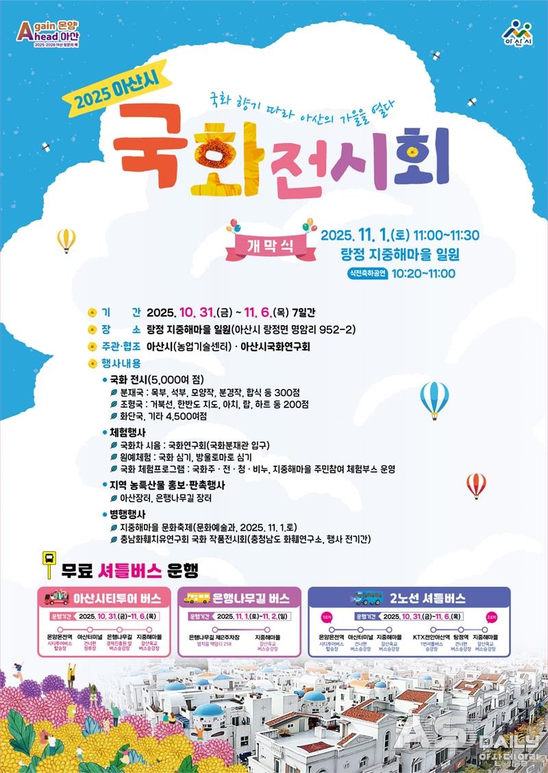 깊어가는 가을, 충남 아산시 탕정면 지중해마을이 국화 향기로 물든다. 아산시는 오는 10월 31일부터 11월 6일까지 7일간 ‘2025 아산시 국화전시회’를 개최한다고 밝혔다. 이국적인 건축미와 국화의 풍성한 색채가 어우러진 이번 행사는 시민과 관광객에게 가을 정취를 오감으로 느낄 수 있는 특별한 경험을 제공한다.