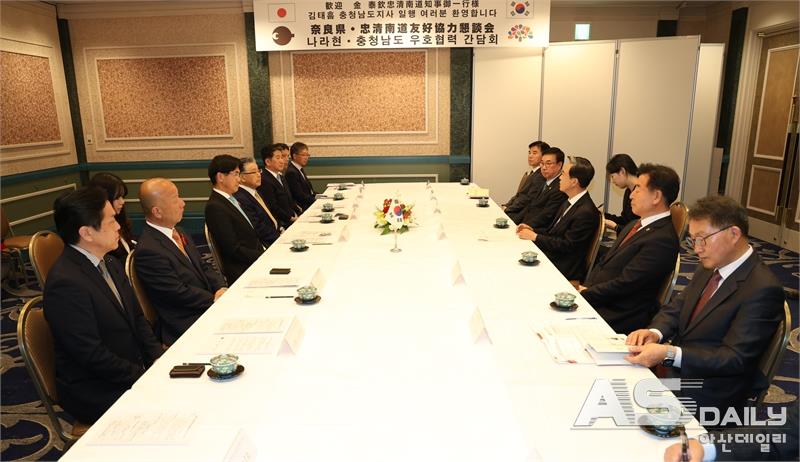 김 지사는 24일 일본 나라현 호텔 닛코 나라에서 야마시타 마코토 나라현 지사와 다나카 다다미쓰 현의회 의장을 비롯한 주요 인사들과 공식 면담을 가졌다. 이 자리에는 후지노 요시쓰구 부의장, 오쿠니 마사히로 총무경찰위원장, 이와타 구니오·이케다 노리히사 의원 등도 참석해 충남 대표단을 환영했다.