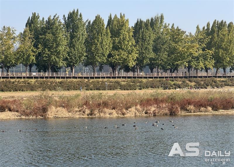가을이 되면 이곳은 더욱 특별해진다. 바람에 흔들리는 억새밭이 강변을 따라 펼쳐지고, 노랗게 물든 은행나무가 따뜻한 색감을 더한다. 이른 아침엔 물안개와 은행잎이 어우러져 몽환적인 분위기를 자아내고, 해 질 녘엔 석양을 머금은 억새가 반짝이며 장관을 이룬다. 물 위를 유유히 떠다니는 오리떼를 바라보며 ‘물멍’을 즐기는 이들도 적지 않다.