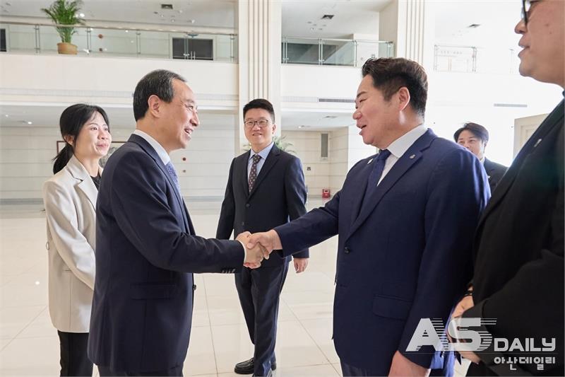 ▲11월 5일 오세현 아산시장(오른쪽)이 중국 동관시청을 방문해 뤼청시 중국 동관시장과 만나고 있다.