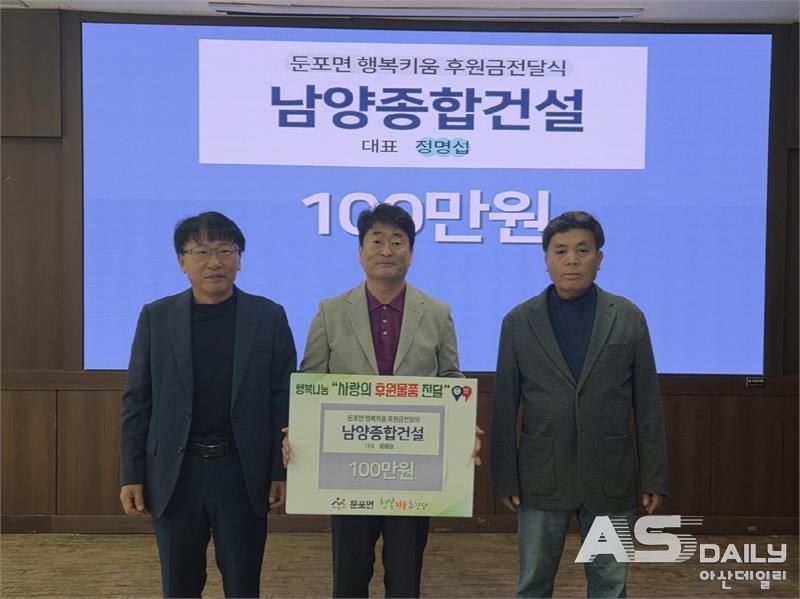 아산시 둔포면이 지역기업의 따뜻한 후원으로 겨울 복지 준비에 나섰다. 둔포면 행복키움추진단(공동단장 이모완, 유영숙)은 지난 7일 남양종합건설㈜(대표 정명섭)로부터 관내 취약계층을 위한 이웃사랑 후원금 100만 원을 전달받았다고 밝혔다.