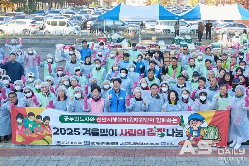 천안시는 12일 천안시행복키움지원단장협의회와 천안시청공무원노동조합과 함께 ‘2025 겨울맞이 사랑의 김장나눔’을 개최했다. 행사에는 김석필 천안시장 권한대행 부시장을 비롯해 읍면동 행복키움지원단원과 공무원노조 임원 등 100여 명이 참여했다.