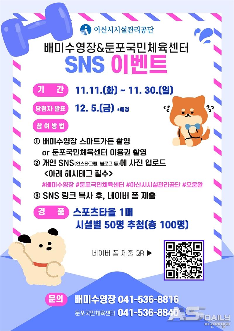 아산시시설관리공단(이사장 김효섭)은 11월 11일부터 30일까지 배미수영장과 둔포국민체육센터에서 시민 참여형 ‘포토존·운동 인증 이벤트’를 진행한다고 밝혔다.