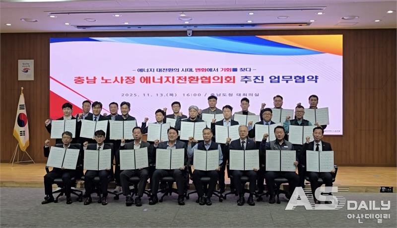13일 충남도청 대회의실에서 열린 협약식에서 도는 ‘충남 노사정 에너지전환협의회 구성·운영 업무협약’을 체결했다. 이어 내포신도시 홍성군에 협의회 사무실을 개소하며 본격적인 활동 기반을 마련했다.