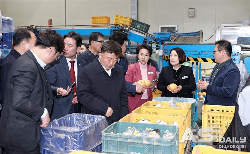 이어 아산원예농협 과수거점산지유통센터(APC)를 방문해 배·사과 등 지역 대표 과수의 집하·선별·저장·출하 과정을 점검했다. 2012년 개장한 이 센터는 연간 약 1만 9,600톤의 과수를 취급하며 대형 유통업체와 도매시장, 해외 수출까지 담당하는 핵심 거점이다. 농수해위는 선별시설 효율성, 저온저장고 운영 수준, 상품화 설비 확충 필요성 등을 세밀히 살펴보며 농가의 안정적 판로 확보와 산업 경쟁력 강화를 위한 개선점을 짚었다.