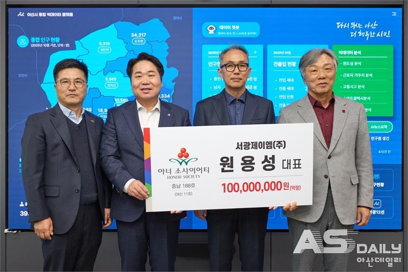 성우종 충남사회복지공동모금회 회장은 “서광제이엠㈜와 원용성 대표, 한승은 님의 가입은 아산 지역 나눔문화 확산에 큰 의미가 있다”며 “앞으로도 많은 기업과 개인들이 지역사회에 긍정적인 변화를 만들어내길 기대한다”고 말했다.