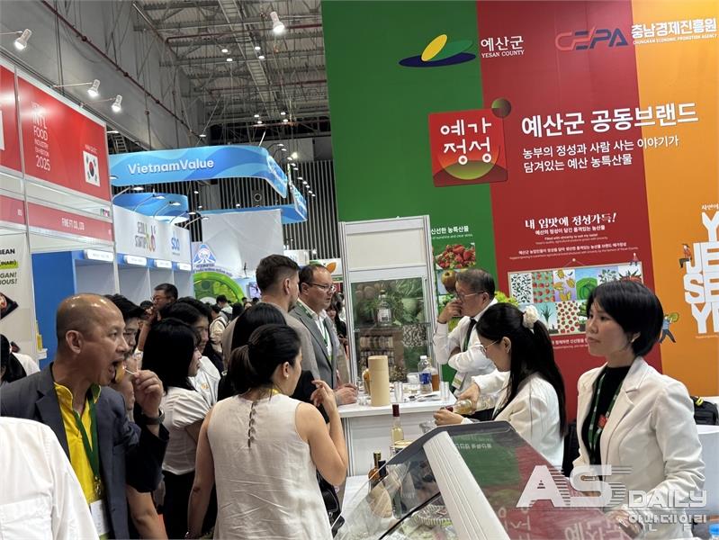 예산군은 지난 12일부터 15일까지 베트남 호찌민에서 열린 Vietnam Food Expo 2025에 관내 기업 두 곳과 함께 참여해 ‘예가정성 홍보관’을 운영했다. 이번 홍보관에서는 황토사과, 사과와인·블루베리와인, 사과 생즙, 한과 등 예가정성 인증을 받은 가공품을 전시해 현지 바이어와 참관객들의 관심을 끌었다.