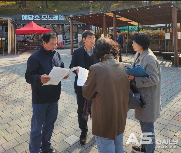 ▲[예당호 모노레일 앞 광장] 예당호 모노레일 관련 설명을 듣고 있는 아산시의회 천철호 의원