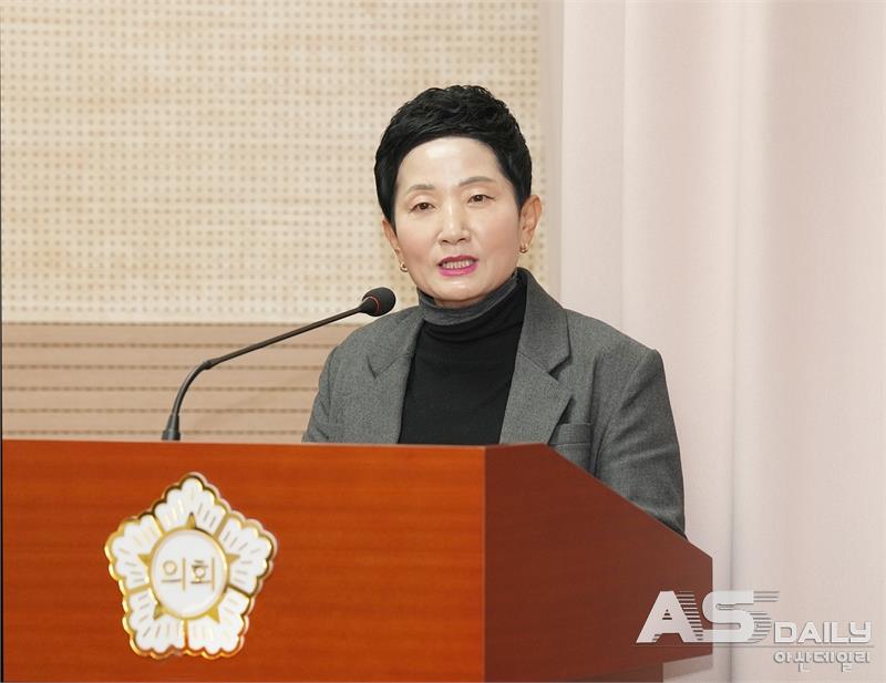 ▲이기애 의원이 「아산시 노후농기계 조기 폐기 지원 조례안」을 발의하고, 취지를 설명하고 있다.
