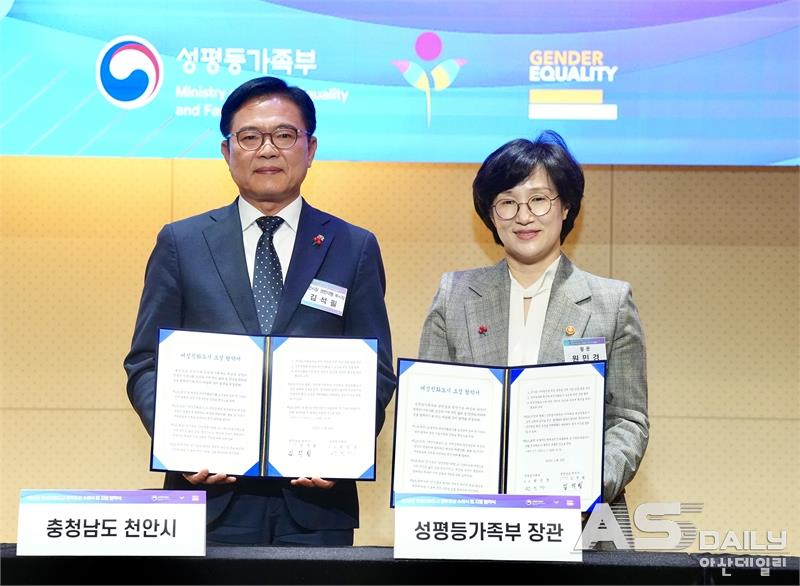 천안시는 26일 서울 페럼타워에서 성평등가족부와 여성친화도시 재지정 협약을 체결했다. 협약식에는 김석필 천안시장 권한대행과 원민경 성평등가족부 장관이 참석해 서명했다.