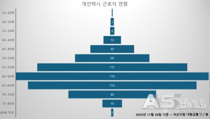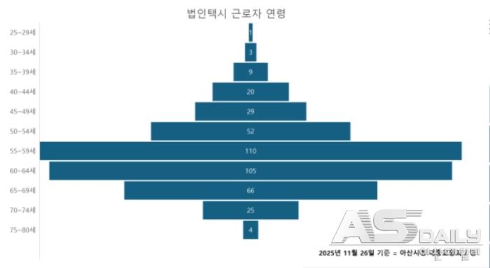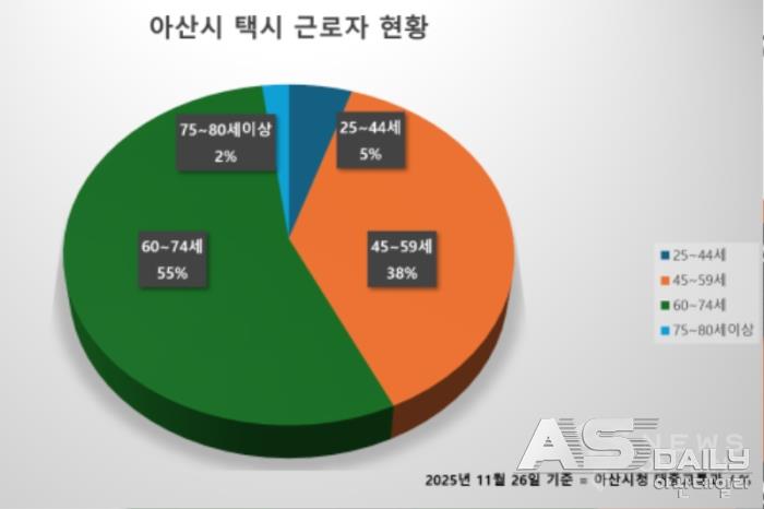 이 중 25세에서 44세는 5%, 45세에서 59세는 38%, 60세에서 74세는 55%, 75세에서 80세 이상은 2%를 차지하면서 아산시 택시는 고령화가 빠르게 진행되고 있다.
