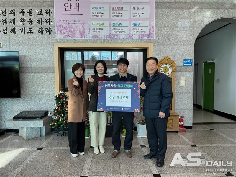 이유영 온양4동장은 “매년 꾸준히 이웃사랑을 실천해 주시는 온양신광교회에 깊이 감사드린다”며 “전달된 성금이 꼭 필요한 분들께 의미 있게 지원될 수 있도록 최선을 다하겠다”고 밝혔다.