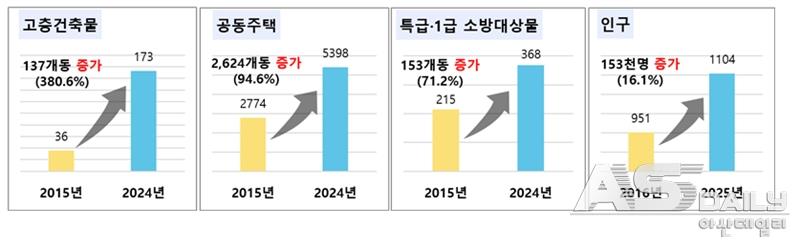 천안‧아산 지역은 수도권과 인접해 교통·물류 중심지로 성장하면서 최근 10년간 인구가 16.1% 증가했다. 공동주택은 94.6%, 고층 건축물은 380.6% 늘었으며, 특급·1급 소방대상물은 71.2%, 공장은 34.6%, 다중이용시설은 10.3% 증가하는 등 도시 규모와 위험 요인이 동시에 확대되고 있다.