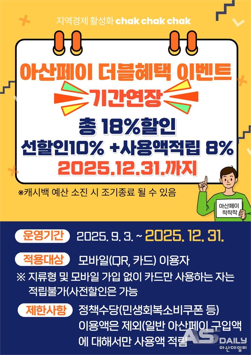 아산시 관계자는 “12월은 충전만 해도 할인, 결제 시 캐시백, 여기에 세금 절감까지 가능한 시기”라며 “연말정산을 준비하는 시민이라면 이번 달이 아산페이를 가장 효율적으로 활용할 수 있는 마지막 기회”라고 강조했다. 이어 “캐시백 혜택은 올해 말 종료될 예정이므로 충전과 사용을 반드시 12월 안에 마쳐야 한다”고 덧붙였다.