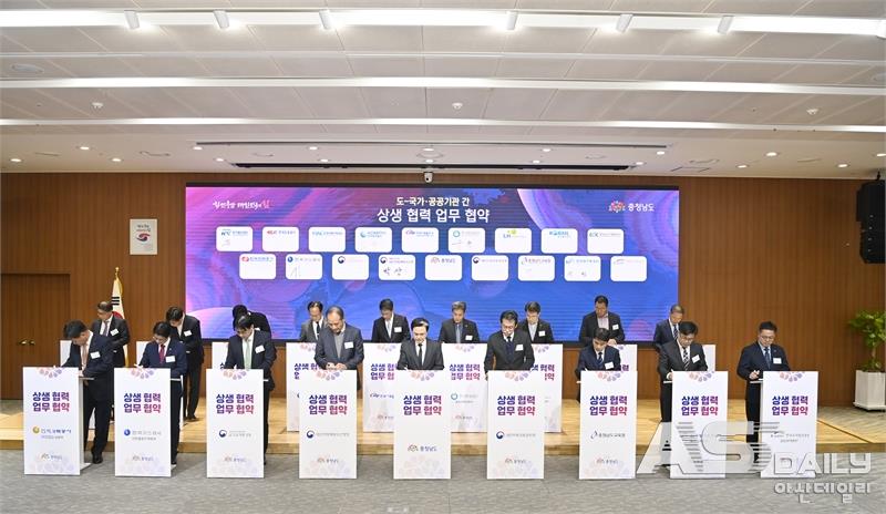 ▲충남도는 10일 도청 대회의실에서 대전지방국토관리청을 비롯한 17개 기관과 ‘충남 지역 건설산업 활성화를 위한 상생 협력 업무협약’을 체결