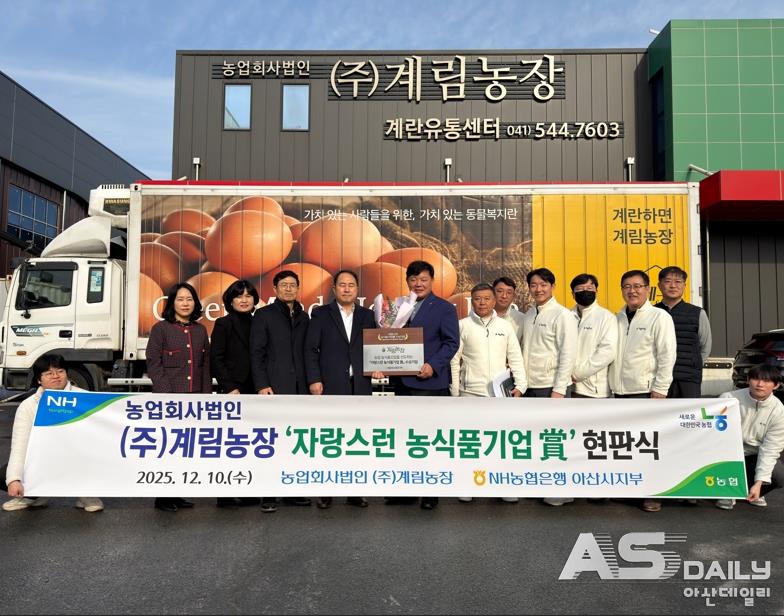 농협은행 아산시지부(지부장 이규황)는 10일 충남 아산에 위치한 양계 전문 기업 ㈜계림농장(대표 홍성학)에서 ‘2025년 자랑스런 농식품 기업상’ 현판식을 진행했다.