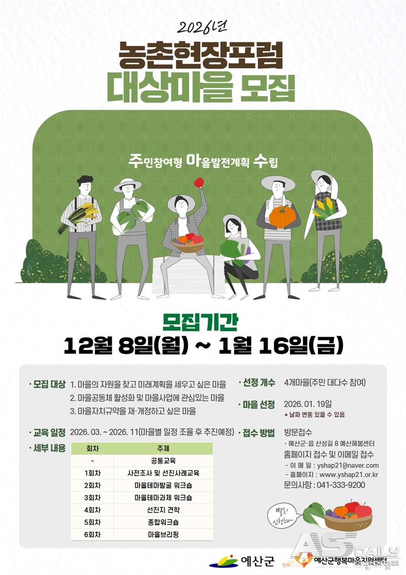 예산군과 예산군행복마을지원센터는 2026년 주민주도 마을발전계획수립(농촌현장포럼)에 참여할 대상 마을을 모집한다고 밝혔다.