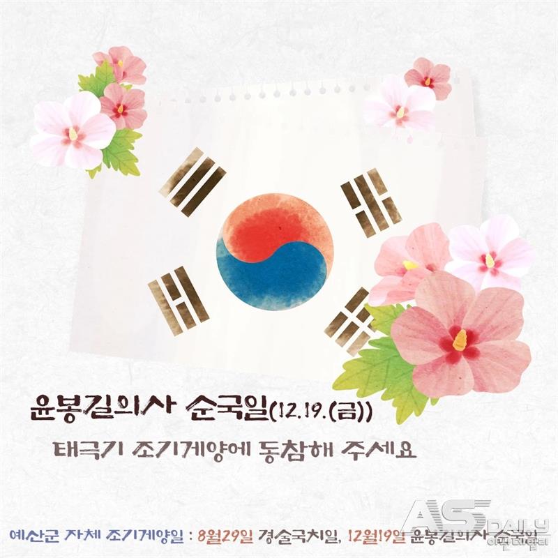 예산군은 올해 조례 개정을 통해 기존 국기 게양일 외에도 △4월 29일 윤봉길 의사 의거일 △8월 29일 경술국치일 △12월 19일 윤봉길 의사 순국일을 조기 게양일로 추가 지정했다.