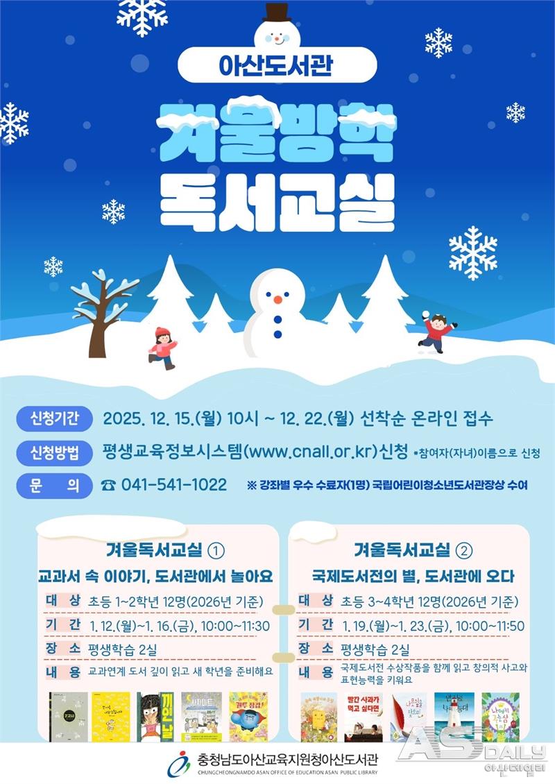 아산도서관(관장 박찬희)은 내년 1월 12일부터 23일까지 총 2주간 겨울독서교실을 운영한다. 이번 프로그램은 학년별 특화 과정으로 구성됐다. 예비 초등 1·2학년은 교과 연계 도서를 깊이 읽으며 새 학년을 준비하는 ‘교과서 속 이야기, 도서관에서 놀아요’에 참여한다. 초등 3·4학년은 국제도서전 수상작을 함께 읽고 창의적 사고와 표현 능력을 키우는 ‘국제도서전의 별, 도서관에 오다’ 과정에 참여할 수 있다.