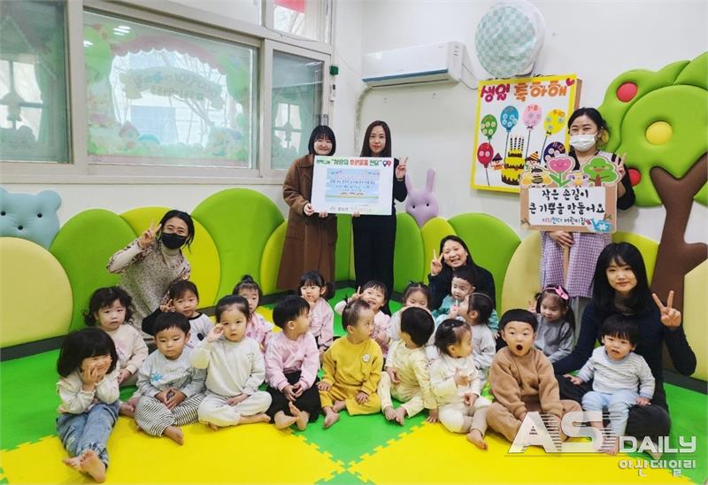 아산시 둔포면 소재 이지킨더어린이집이 원아들과 함께한 바자회 수익금을 지역의 어려운 이웃을 위해 기탁했다. 어린이들의 작은 손길이 모여 마련된 후원금은 둔포면 행복키움추진단을 통해 저소득 취약계층 지원에 사용될 예정이다.