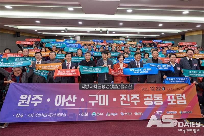 22일 국회의원회관 제2소회의실에서 열린 ‘지방자치 균형성장 발전을 위한 공동포럼’에는 오세현 아산시장을 비롯해 원주·구미·진주시 단체장과 지역 국회의원, 전문가들이 참석했다. 이 자리에서 4개 도시는 대도시 특례 기준 완화와 관련한 공동건의문에 서명하고 정부와 국회에 공식 건의했다.