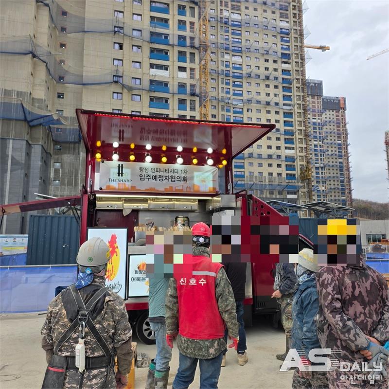 지난 23일 오전 11시, 영하 6도의 강추위가 이어진 아산 탕정인피니티시티 1차 공사 현장에 입주예정자협의회가 준비한 어묵차와 핫팩 500개가 전달됐다. 협의회는 “안전하고 쾌적한 주거 환경을 위해 현장에서 애쓰는 근로자들의 노고에 감사하는 마음을 담았다”고 밝혔다.