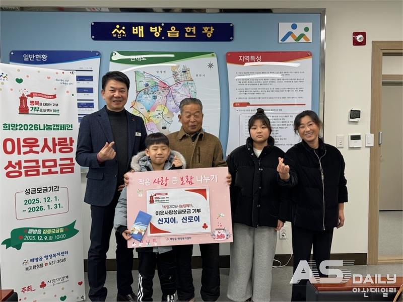 강한용 배방읍장은 “어린이들의 자발적인 나눔 실천이 지역사회에 큰 울림을 주고 있다”며 “작년에 이어 올해도 따뜻한 마음을 전해준 신지이·신로이 남매에게 깊이 감사드린다”고 밝혔다.