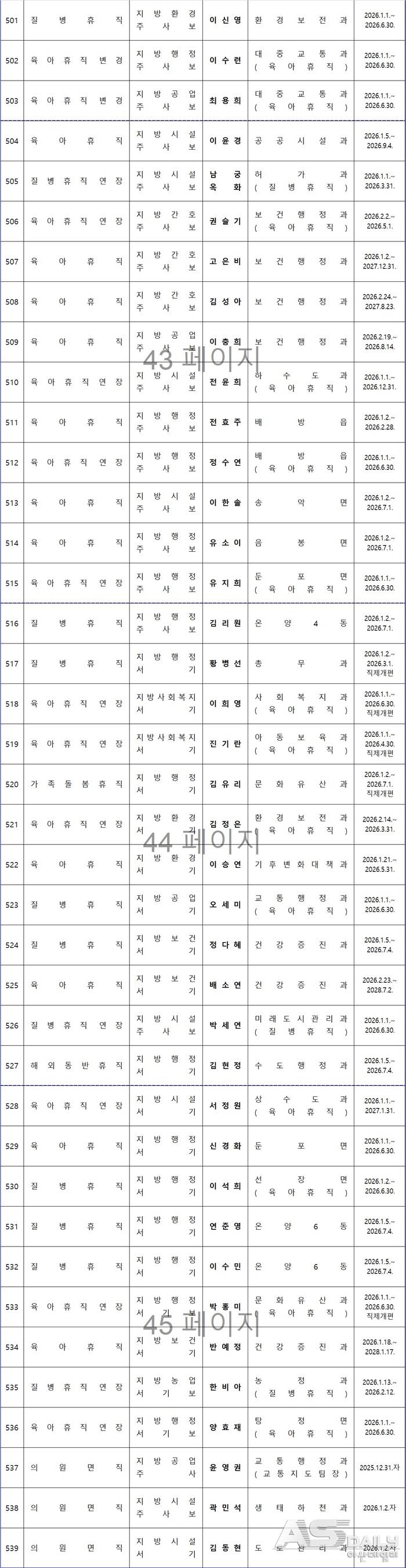 아산시 홍보담당관실은 2025년 12월 26일 공식 보도자료를 통해 내년 1월 1일자로 시행되는 인사 내용을 발표했다. 0 0 아산데일리 [아산데일리=박동민기자] asandaily@daum.net [아산데일리=박동민기자]의 기사 더보기 저작권자 아산데일리 무단배포 금지