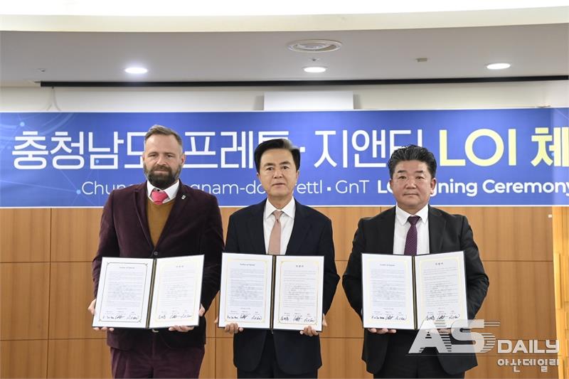▲26일 충남도청 상황실에서 열린 투자 협력 의향서 체결식 김태흠 충남지사, 손일수 지앤티 대표, 빌리 프란츠 프레틀 CEO