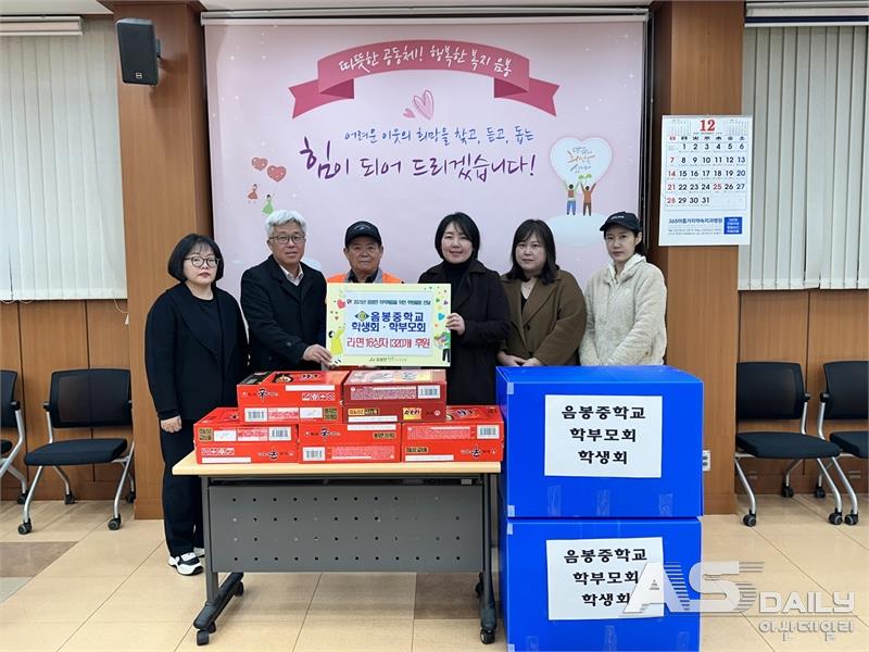 연말을 맞아 아산시 음봉중학교 학생회와 학부모회가 지역사회에 따뜻한 나눔을 실천했다. 지난 30일, 이들은 음봉면 행복키움추진단에 라면 16상자(320개)를 전달하며 취약계층 지원에 힘을 보탰다. 학생과 학부모가 함께 참여한 이번 후원은 단순한 물품 기부를 넘어, 세대가 함께 나눔의 가치를 실천하는 의미 있는 자리로 평가된다.