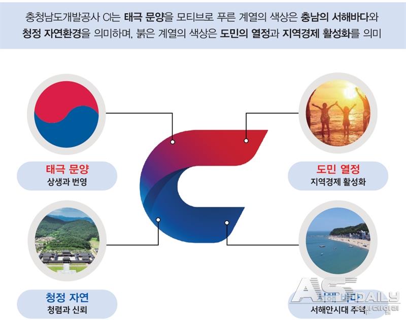 새 CI는 서해 바다의 푸른 빛과 붉게 타오르는 물결을 형상화한 디자인으로, 충청의 영문 이니셜 ‘C’와 태극 문양을 모티브로 삼았다. 이는 충남의 역동성과 공사의 추진력을 시각적으로 표현하며, 변화와 성장의 흐름을 담아낸다.
