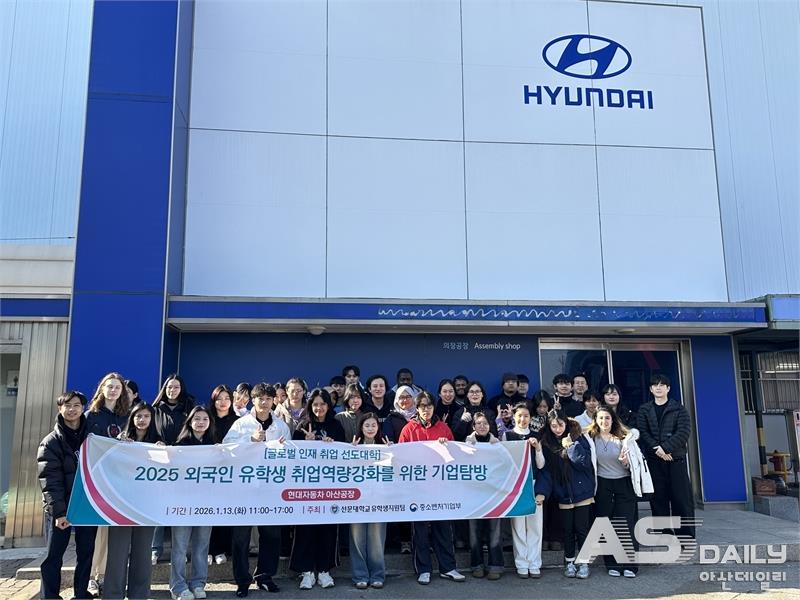 선문대(총장 문성제)는 13일 ‘글로벌 인재 취업 선도대학 사업’의 일환으로 외국인 유학생 40명과 운영진 4명 등 총 44명을 현대자동차 아산공장에 초청해 기업 탐방을 실시했다. 참가자들은 기업 소개 브리핑, 홍보관 관람, 차량 생산·조립 공정 견학 등 다양한 프로그램을 통해 실제 제조 현장을 체험했다.
