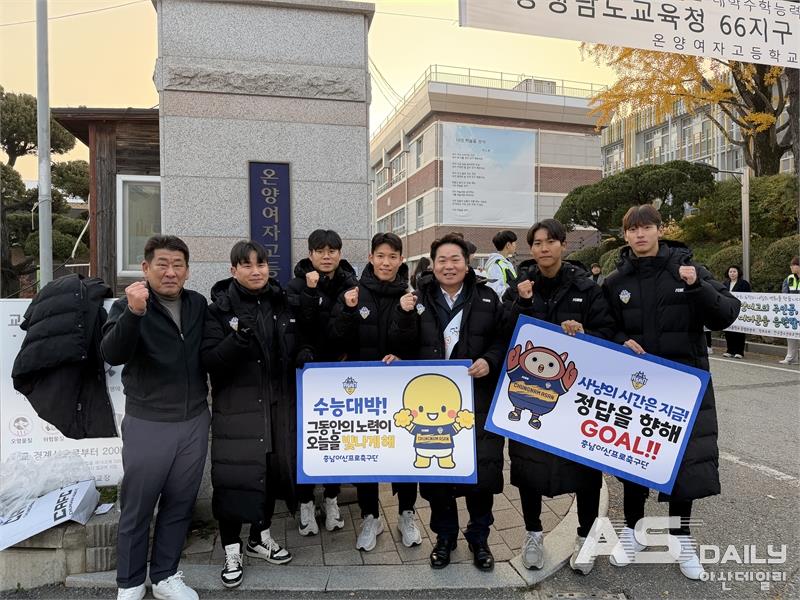충남아산FC가 경기장이 아닌 수능 시험장으로 향했다. 구단은 지역 학생 팬들의 응원에 보답하기 위해 직접 고사장을 찾아 수험생들에게 따뜻한 격려와 간식을 전달하며 특별한 하루를 함께했다.13일 오전 충남아산프로축구단(충남아산FC) 사무국 직원과 선수단 50여 명은 아산 지역 내 대학수학능력시험 고사장 8곳(배방고, 설화고