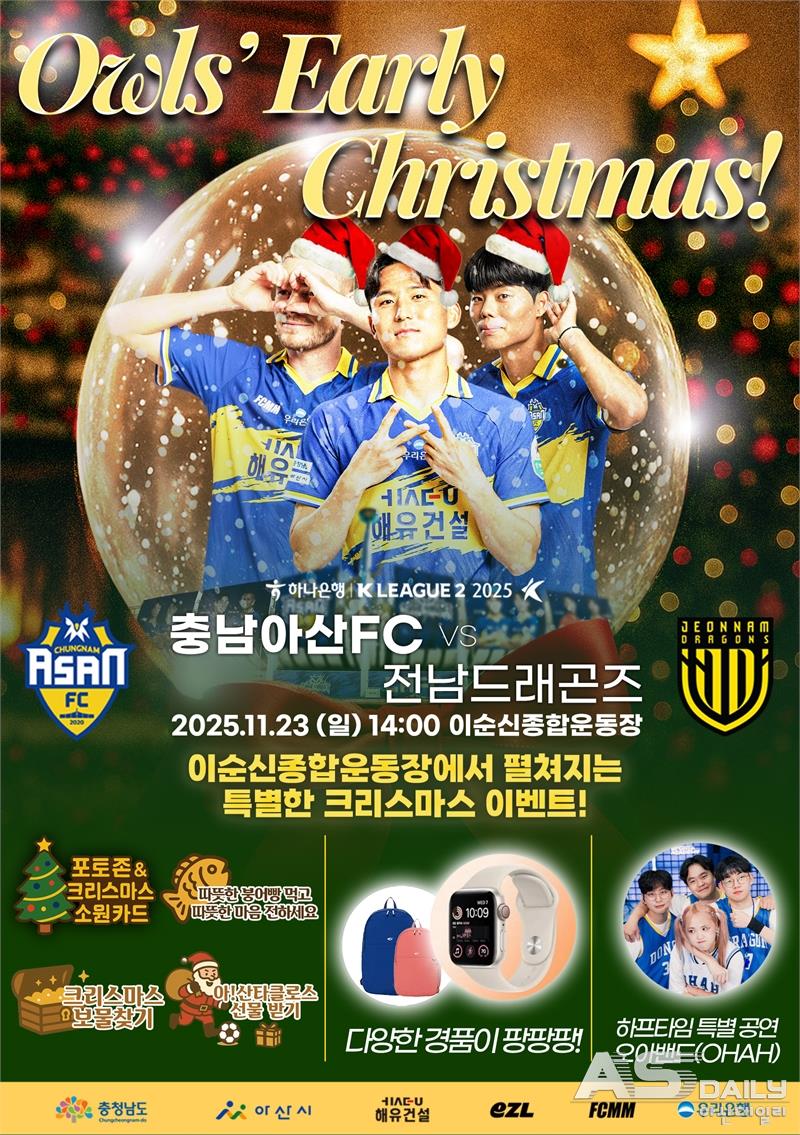 충남아산FC가 올 시즌 마지막 홈 경기에서 팬들에게 특별한 선물을 준비했다. 오는 23일 이순신종합운동장에서 열리는 전남드래곤즈와의 K리그2 39라운드 폐막전은 ‘미리 메리크리스마스’를 테마로 꾸며져, 경기와 이벤트가 어우러진 축제의 장이 될 전망이다.충남아산FC는 올 시즌 전남과 두 차례 맞붙어 모두 무승부를 기록했으며