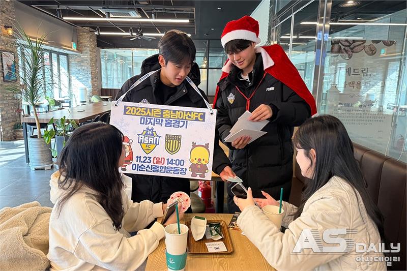 충남아산FC가 시즌 마지막 홈경기를 앞두고 시민과 대학가를 직접 찾아가며 열기를 끌어올렸다. 선수단은 산타와 루돌프로 변신해 팬들과 깜짝 만남을 가지며 ‘홈 피날레’ 흥행을 위한 총력전에 나섰다.지난 20일, 충남아산FC 선수단은 아산시청과 관내 주요 대학(선문대·순천향대·호서대)을 돌며 게릴라 홍보 활동을 펼쳤다. 이번