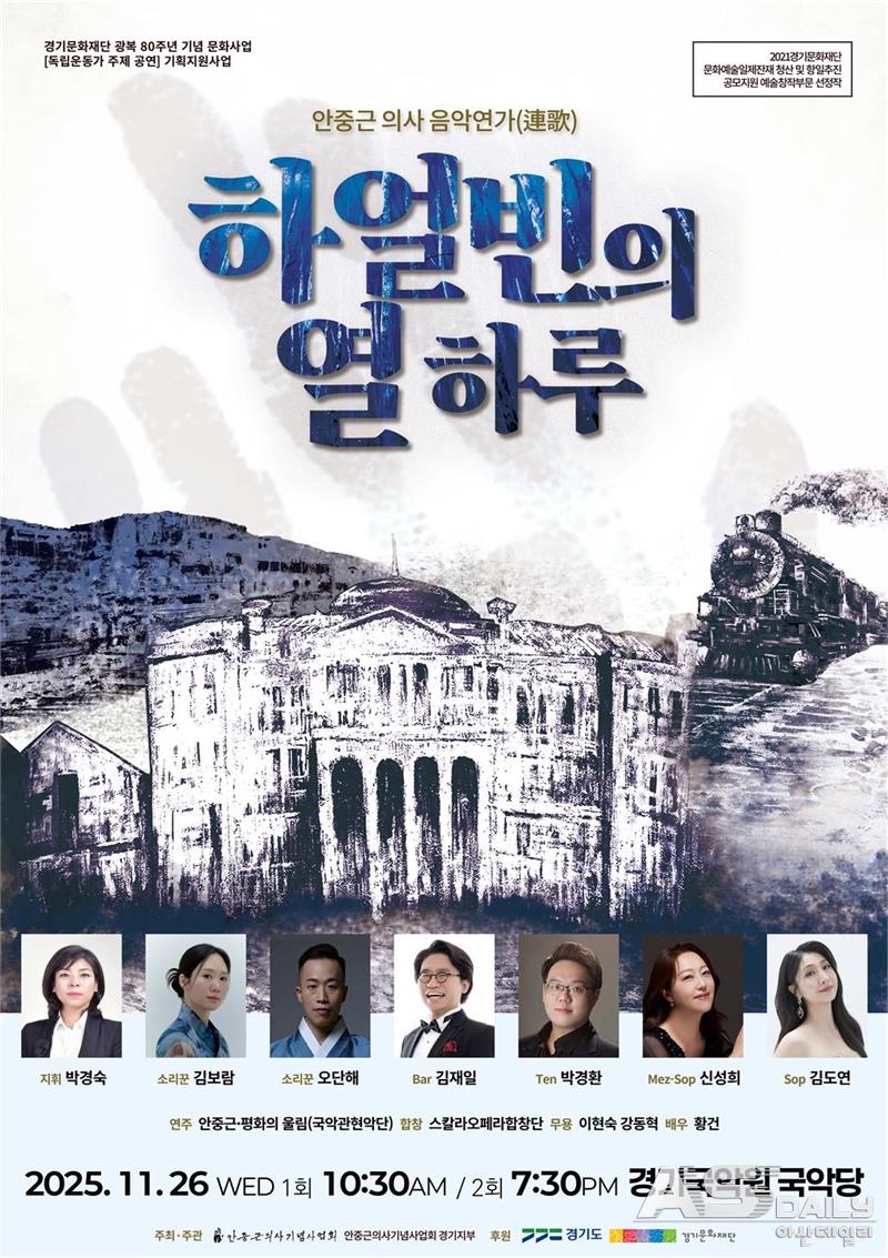 광복 80주년을 맞아 안중근 의사의 하얼빈 ‘열하루’를 음악으로 재현하는 무대가 마련된다. 오는 11월 26일 경기국악원 국악당에서 공연되는 음악연가 ‘하얼빈의 열 하루’는 국악관현악과 판소리, 성악과 합창을 결합해 항일의 메시지를 예술적으로 풀어내는 작품으로, 독립과 평화의 정신을 현재 무대에 소환한다.이번 공연은 경기