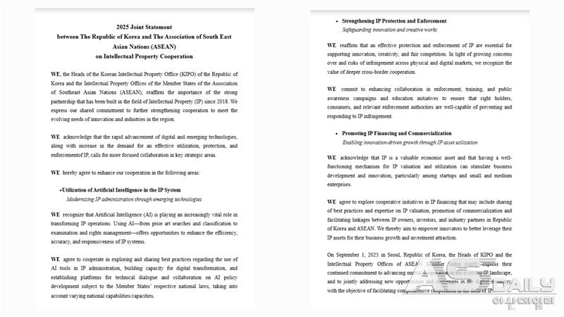 한-아세안 지식재산 협력이 새로운 전기를 맞았다. 9월 1일 서울 마포구 호텔 나루 엠갤러리에서 열린 제8차 한-아세안 특허청장 회의에서 한국과 아세안 10개국은 ‘2025 공동선언문’을 채택하며 인공지능 기반 행정 혁신과 지식재산 보호 강화를 위한 협력 확대에 뜻을 모았다.이번 회의는 2018년 브루나이에서 체결된 지식