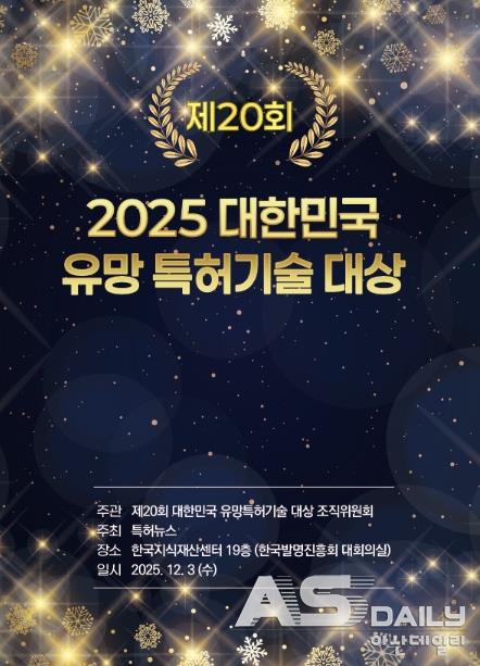 창간 20주년을 맞은 특허전문지 특허뉴스가 주최하는 ‘제20회 2025 대한민국 유망특허기술 대상’ 시상식이 오는 12월 3일 수요일 서울 역삼동 한국지식재산센터 19층 대회의실에서 열린다. 본 행사는 중소기업·벤처·스타트업 등 우수 특허기술 보유 주체의 지식재산(IP) 경영 가치를 가시화하고, 기술의 사업화·수출·브랜드